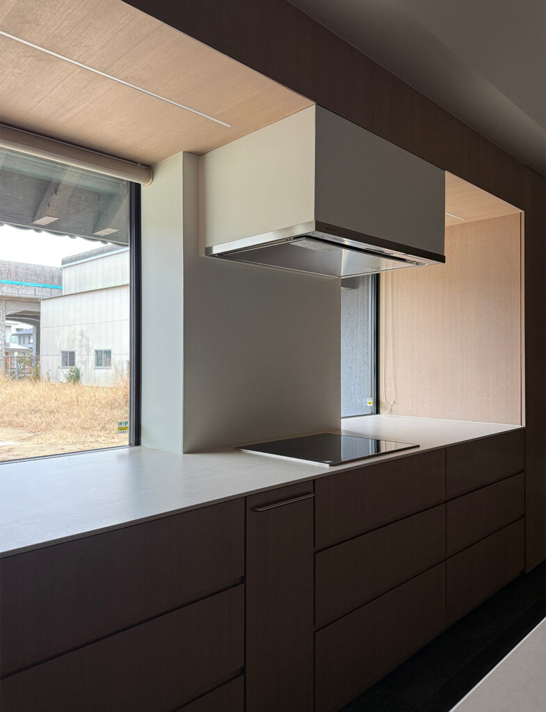 壁面の木製収納に美しく組み込まれた、Miele(ミーレ)製のビルトインオーブン。その隣にはスクエアな窓があり、ワークトップが窓辺まで伸びて機能的なスペースを作り出しています。窓の外にはのどかな風景が広がり、直線の構成が美しい和モダンの機能美を象徴するカットです。