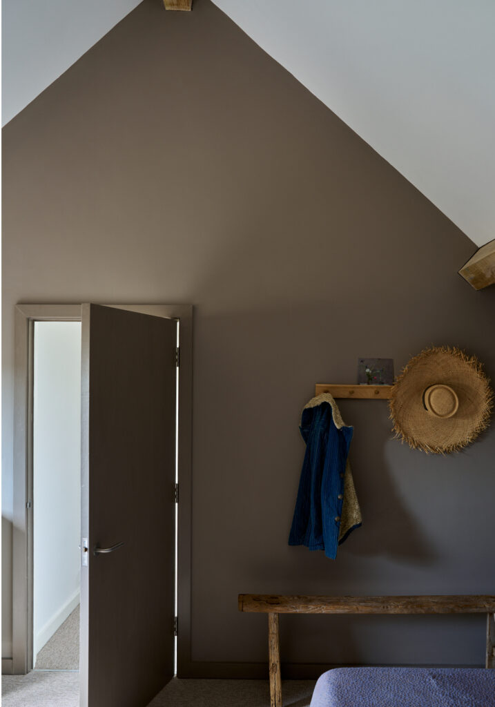 寝室の壁一面に塗られたダークカラーの No.305 Hopper Head。光が入る空間では決して重たく見えず、静寂の中でゆったりとしたくつろぎを感じます。